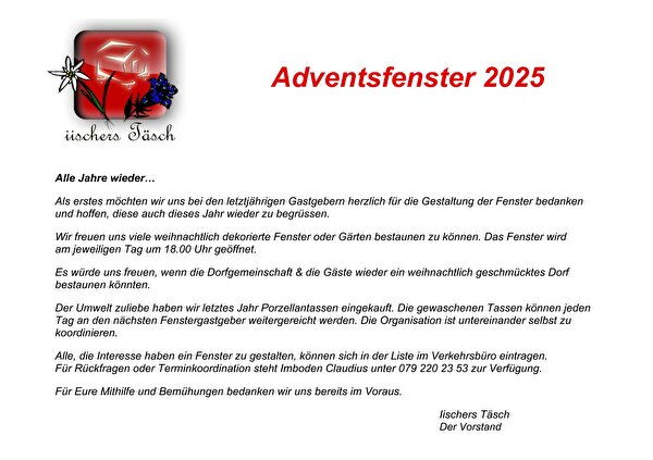 Als erstes möchten wir uns bei den letztjährigen Gastgebern herzlich für die Gestaltung der Fenster bedanken und hoffen, diese auch dieses Jahr zu begrüssen.