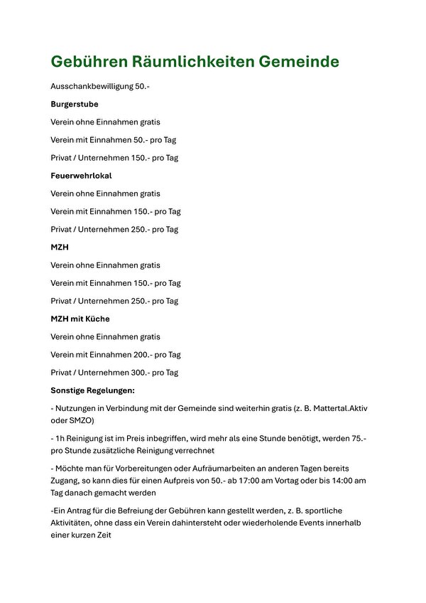 Preisliste Räumlichkeiten der Gemeinde Täsch
